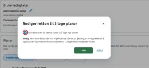 4. Under «Brukerrettigheter»: Klikk på blyanten og ta bort muligheten til å lage nye planer. Lagre.